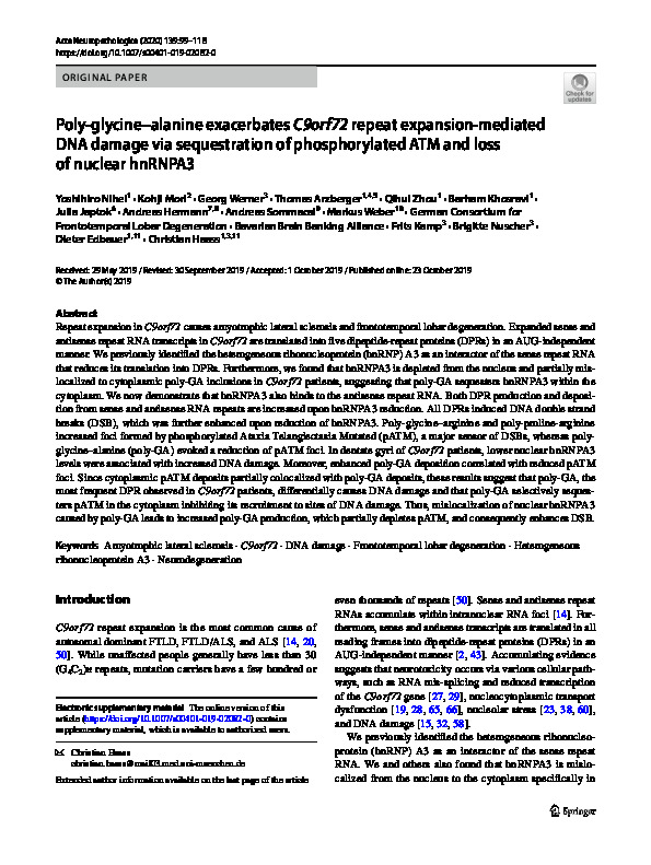 | Home > Publications Database > Poly-glycine-alanine exacerbates C9orf72 repeat expansion-mediated DNA damage via sequestration of phosphorylated ATM and loss of nuclear hnRNPA3. > Access to Fulltext |